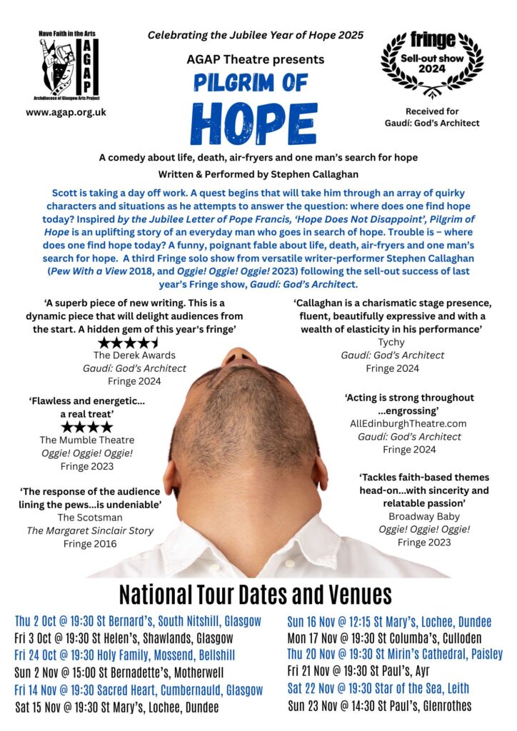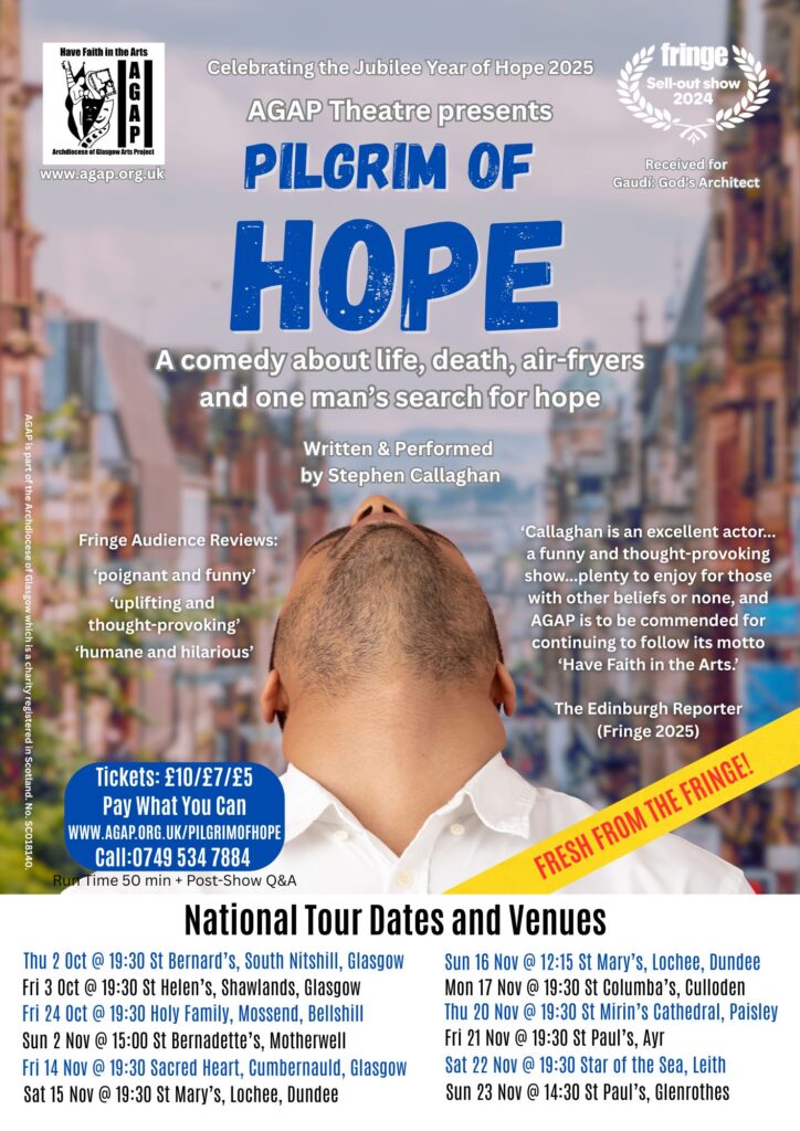 Stephen Callaghan’s brand new comedy play tells an uplifting story of an everyday man, Scott Adams, who goes in search of Hope.  Trouble is – where does one find Hope today?  Pilgrim of Hope is a one-hour play that has all the elements of a classic folktale but set amidst the people and problems of our present time.  Developed for the Jubilee Year of Hope, it received great reviews at the Edinburgh Festival Fringe 2025 and will tour parishes and schools nationally.  It is the third solo show by writer-performer Stephen Callaghan (“Pew With a View” 2018 and “Oggie! Oggie! Oggie!” 2023) as he takes on multiple character roles to tell this funny, energetic story about life, death and air-fryers and one man’s search for hope. Enquire now to book for your secondary school or parish/community venue! Available from Spring 2025.